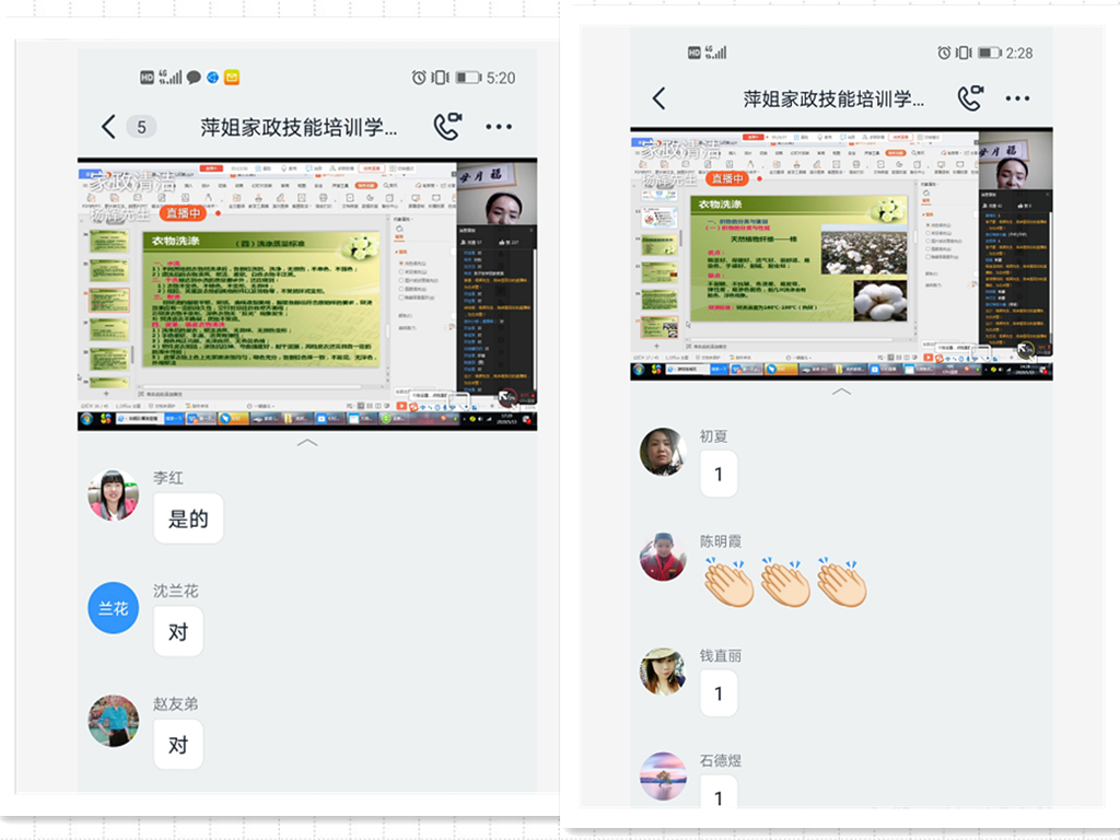 培训采用钉钉线上直播间方式进行,主要围绕家政服务员的职业道德、个人素养,婴幼儿科学育喂养、护理及教育,老人陪护和生活照料、以及社会主义核心价值观、新民风建设、新冠肺炎病毒防控知识等内容。培训总课时不少于30节。参与培训的学员都能按时上课、认真听课、积极上互动。截止目前已有100余人进入了本次线上直播间。