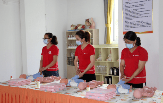 在“南粤家政”(江门)培训综合基地育婴教学区,学员们正在认真进行宝宝抚触操学习。
