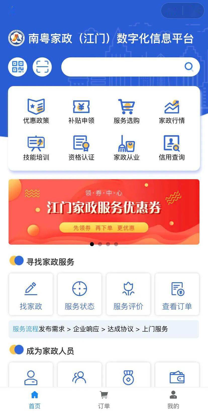打开“五邑人社”小程序,进入“找家政”页面,即可选购钟点工、保洁清洗、月嫂、管家、保姆等家政服务,了解“南粤家政”相关优惠政策、补贴,家政从业人员还能在平台上报名家政培训、资格认证、补贴申请等。