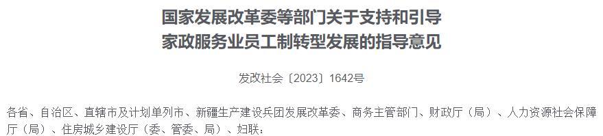 据国家发展改革委,家政服务是爱心工程、民心工程,事关千家万户的福祉。促进家政服务业向员工制转型发展,是家政服务业提质扩容的重要改革举措,有利于规范家政行业发展,提升家政从业人员社会认同度,扩大高水平家政服务供给。为深入贯彻落实《关于促进家政服务业提质扩容的意见》(国办发〔2019〕30号),促进家政服务业员工制转型发展,现提出如下意见。