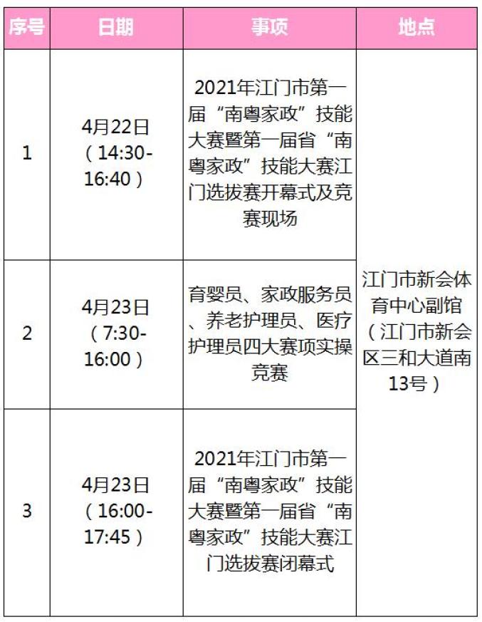4月23日,2021年江门市第一届“南粤家政”技能大赛暨第一届省“南粤家政”技能大赛江门选拔赛将在江门市新会体育中心副馆举办。通过层层选拔,优中选优的97名“南粤家政”精英将同台竞技,一决高下,角逐代表江门市参加省赛的名额,大赛分育婴员、家政服务员、养老护理员和医疗护理员四大赛项进行,竞技能、展风采,四个项目共产生8名选手跻身省赛。