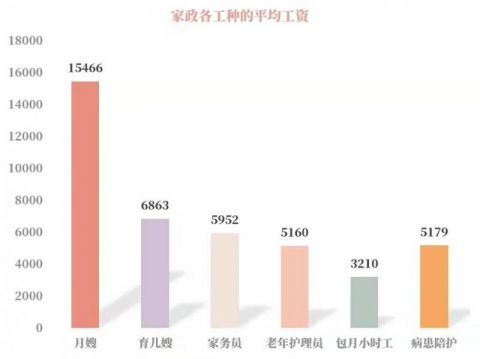 2021年阿姨来了平台显示,月嫂、育儿嫂、家务员、老年护理员、病患陪护、包月小时工的月平均工资分别为15466元、6863元、5952元、5160元、5179元、3210元(3小时/月)。月嫂平均月薪最高,育儿嫂次之,二者均为知识型家政服务,包月小时工最低,这与各类家政服务工作时间和强度密切相关,我们能看出知识型家政阿姨在未来的巨大发展势能。病患陪护的单日工资300元/天(北京)左右,月度统计结果略低的原因可能是由于时间短,待岗时间长,连续服务不足一个月所致。