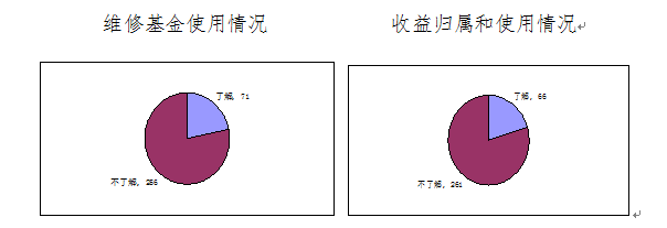 接受调查的消费者中,大部分对维修基金使用及小区收益归属和使用情况不了解。根据《物业管理条例》的相关规定,业主在物业管理活动中,享有对物业共用部位、共用设施设备和相关场地使用情况享有知情权和监督权,同时可以监督物业共用部位、共用设施设备专项维修资金的管理和使用等权利。同时该《条例》规定,专项维修资金属于业主所有,专项用于物业保修期满后物业共用部位、共用设施设备的维修和更新、改造,不得挪作他用。