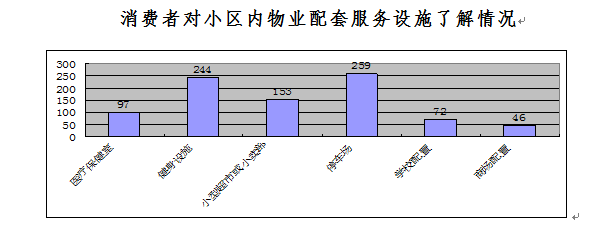 针对消费者对小区内物业配套服务设施了解情况,受调查的消费者中,选择停车场、健身设施的最多,小型超市或小卖部、医疗保健室、学校、商场等也有一定的比例。根据《物业管理条例》相关规定,利用物业共用部位、共用设施设备进行经营的,应当在征得相关业主、业主大会、物业管理企业的同意后,按照规定办理有关手续。业主所得收益应当主要用于补充专项维修资金,也可以按照业主大会的决定使用。一个小区如果配套服务设施多,可以增加相应的收入,该收入由小区住户共享,物业提供的服务设施越多,小区住户便利度、幸福感、满意度也会上升,就会积极缴纳物业费,从而形成一个良性循环。