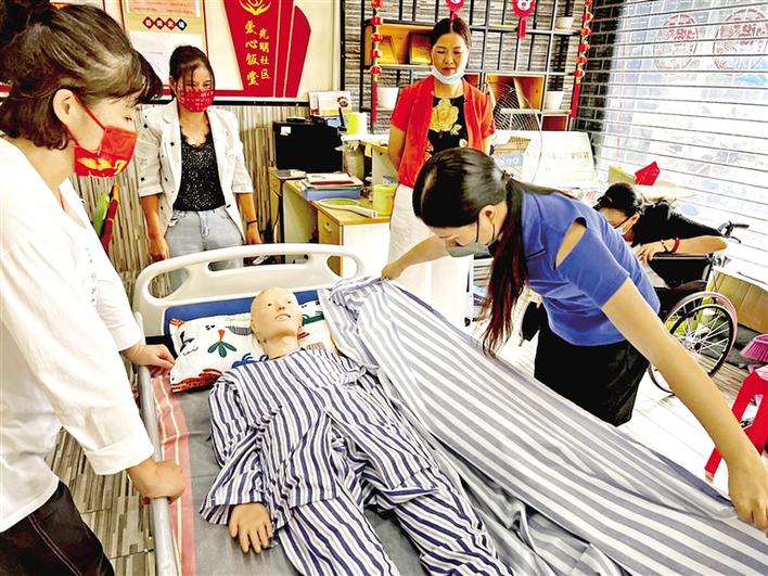 光明区“南粤家政”基层服务站采取公益家政讲座、基本实训操作、网络线上授课等灵活方式,定期为家政服务员、失业人员、社区居民提供家政服务类技能培训。每个基层服务站每个季度至少开展一场培训,全年累计开展母婴、居家、养老和医疗护理等项目培训4352人次。值得一提的是,今年新建成的6家基层服务站中,光明街道“南粤家政”基层服务站、凤凰街道“南粤家政”基层服务站分别设置在光明新村、玖龙台社区综合服务中心。光明区全市首创在社区综合服务中心设立“南粤家政”技能培训基地,配置移动式培训工位30个,开展理论和实操课程培训,提升劳动者职业技能和就业能力。